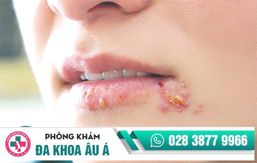 → Mụn rộp ở miệng với triệu chứng: Ngứa, nóng, rát, đỏ ở vùng da quanh miệng, có cảm giác hơi khó chịu, lăn tăn. Sau vài ngày, xuất hiện các mụn nước nhỏ li ti, tập trung thành từng đám ở môi, quanh môi hay má, cằm, mũi,… khi khó khăn trong ăn uống, ngại giao tiếp.