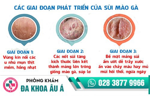 — Sau khoảng thời gian ngắn, các ú nhú này nhanh chóng liên kết thành mảng, có bề mặt hơi mềm nhũn khi dùng tay ấn vào hay cọ sát với quần, quan hệ tình dục dể chảy dịch, đôi khi lẫn máu có mùi hôi thối. Mà chứng gai sinh dục không có.